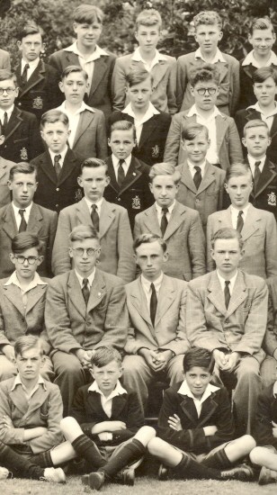 to right. Courtesy of John Butcher (1947). Some faces marked in original. 1/13back: Favell - Terence Watson - Peter Tweed - ( ) row 5: Melvyn Chapman - Andrej Mockzo - RJ Misson - 4 row 4: Harry Carter - ?Nicholls - Colin Hodson - Gerald Gillett - ( ) row 3: Peter Hunt - John Waller - David Sparkes - John Fordham - Bernard Nicholas row 2: David Leonard - Arthur Docherty - Barry Cook - Tom Perry front: Brian Pope - Terry Roberts - Geoffrey Matthews |